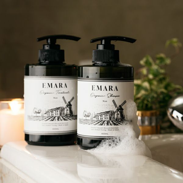 EMARAメンズシャンプーの後にトリートメントすることで、香りの持続効果が高まります。さらに、しっかりと髪をコーティングし、ツヤツヤの髪へ。シャンプー・トリートメントのメンズセット。