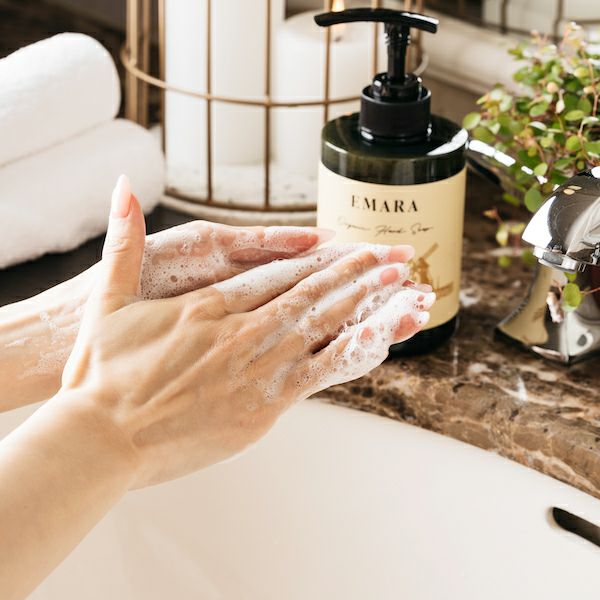 毎日何回も洗う手洗いを楽しみに毎日の手洗いの回数は減らせません。手荒れの悩みをお持ちの方にも、面倒臭いなと思っている方にも、洗うたびに手を労りながらアロマの香りに癒され、手を洗うことが楽しみになるハンドソープ。洗い流す時のヌルつきはすぐにとれて、手を乾燥させることなくしっかりと洗浄するマイルド処方。洗い上がりにシャンパンバスカットの香りが広がり何度も手を洗いたくなるオーガニックハンドソープ。 -