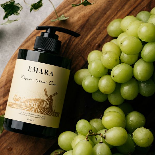 100%天然精油無農薬の畑で採れたフルーツエキス、植物エキス、ハーブエキスで作られたまるでオーガニックジュースのようなハンドソープ。最初に強い香りがくるのではなく、洗いながら自然の香りが後追いして、次第に洗面所に広がり、マスカットの爽やかな香りが手に残ります。自然のフルーツの香りをお楽しみ頂けます。
