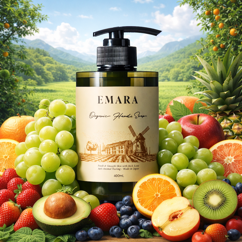 香りは、記憶や感情と深く結びついています。ふとした瞬間に感じるやさしい香りが、安心感や幸福感をもたらしてくれることもあります。EMARAのハンドソープが目指しているのは、強く主張する香りではなく、そっと寄り添うような心地よさ。手を洗ったあとに残るほのかな余韻が、自分自身だけでなく、周囲の人にもやさしい印象を与えてくれるでしょう。長野県の無農薬の畑から栽培されたフルーツから抽出したエキスをそのまま配合しています。強すぎないけどしっかりと香るフルーツエキスは、マスカットの香りを中心に配合されております。